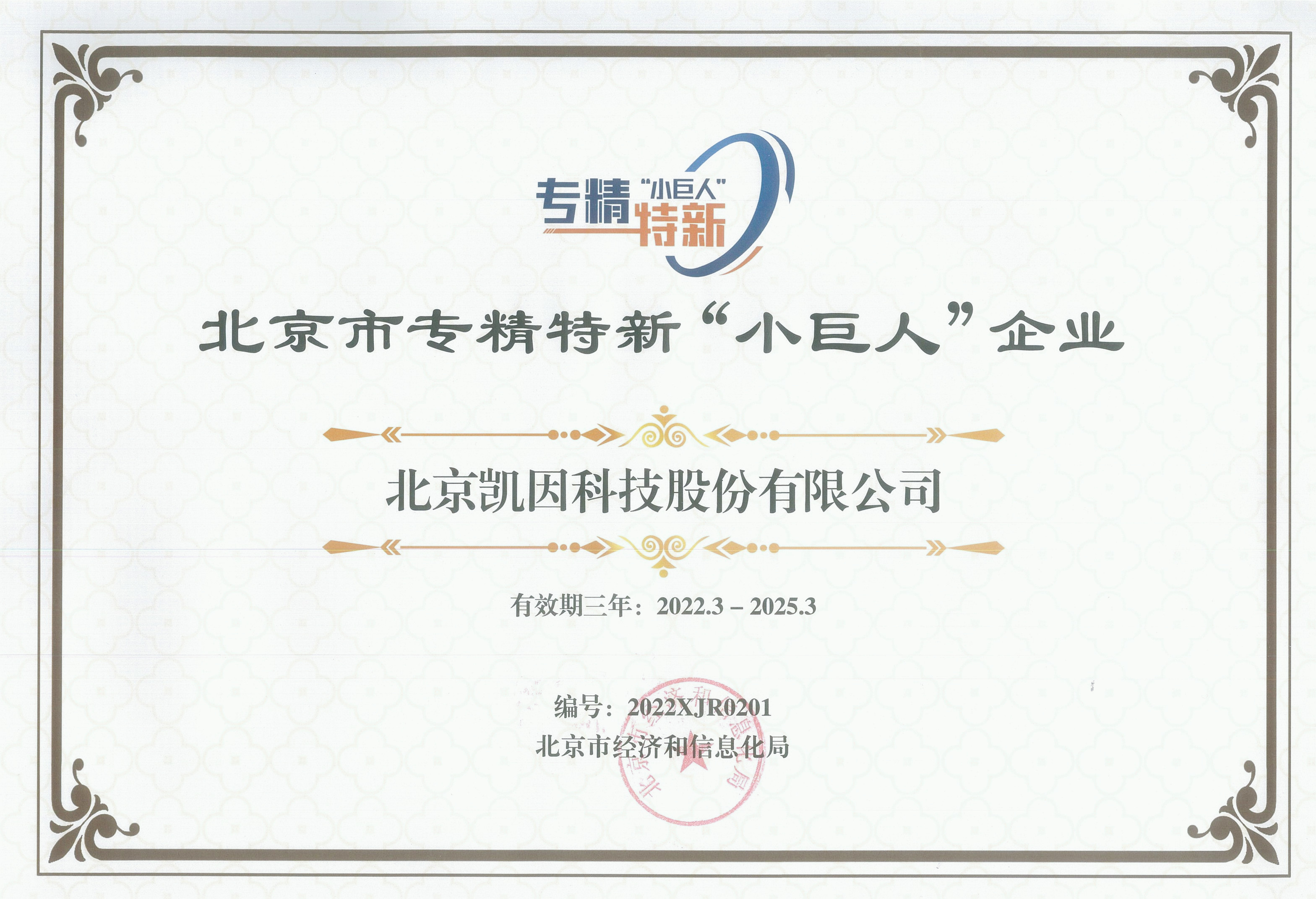 近日,北京市经济和信息化局正式向2021年度第二批北京市专精特新小巨人企业颁发证书,凯因...